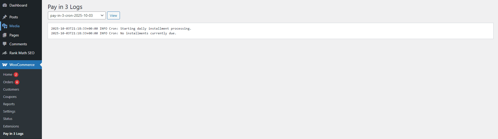 Data Logging: Auditable Installments - Logs the payment setup and 3-part installment schedule directly into the standard WooCommerce Order Notes for an immediate audit trail.
