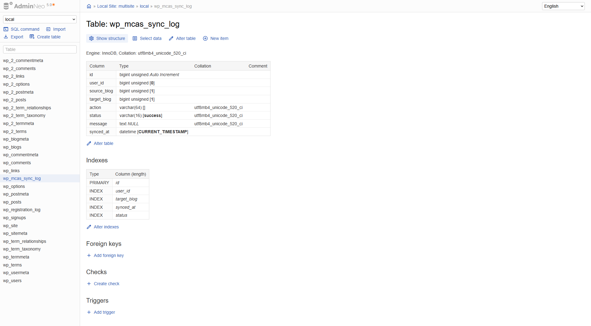 Custom wp_mcas_sync_log database table with 8 columns and 4 indexes — InnoDB, utf8mb4.