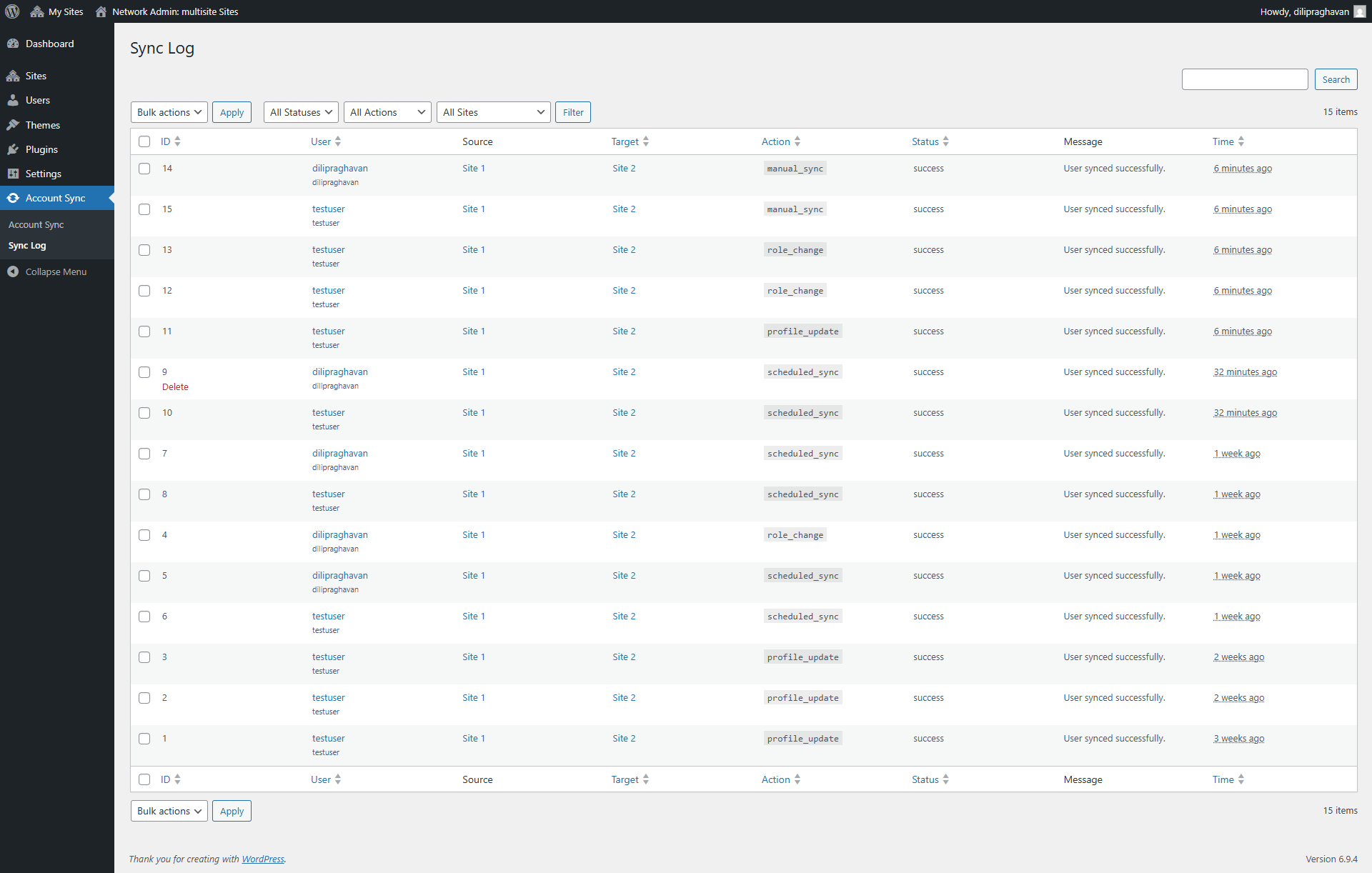 Full automatic user sync across all network subsites triggered by native WordPress events with zero manual intervention. Audit log captures every sync operation with user, source, target, action, status, and timestamp. Network admin panel surfaces real-time sync stats, manual controls, and cron job status in one view. Clean service layer architecture means new sync targets or data sources can be added without touching existing sync logic.